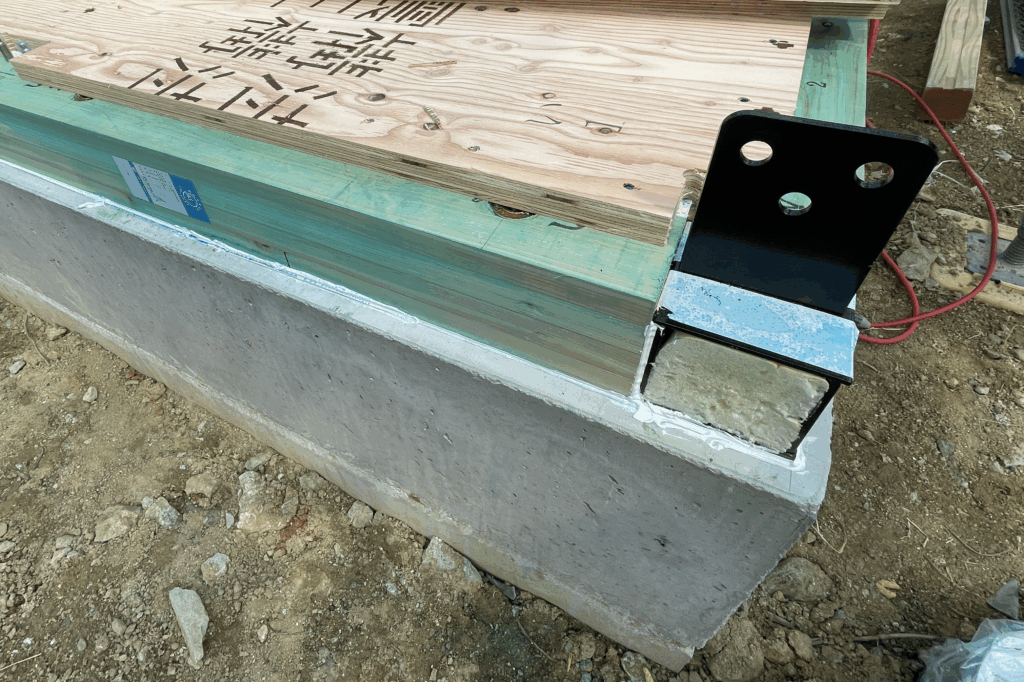 SE構法では主要な柱の足元に「柱脚金物」を設置し、柱と基礎を強力に固定しています。