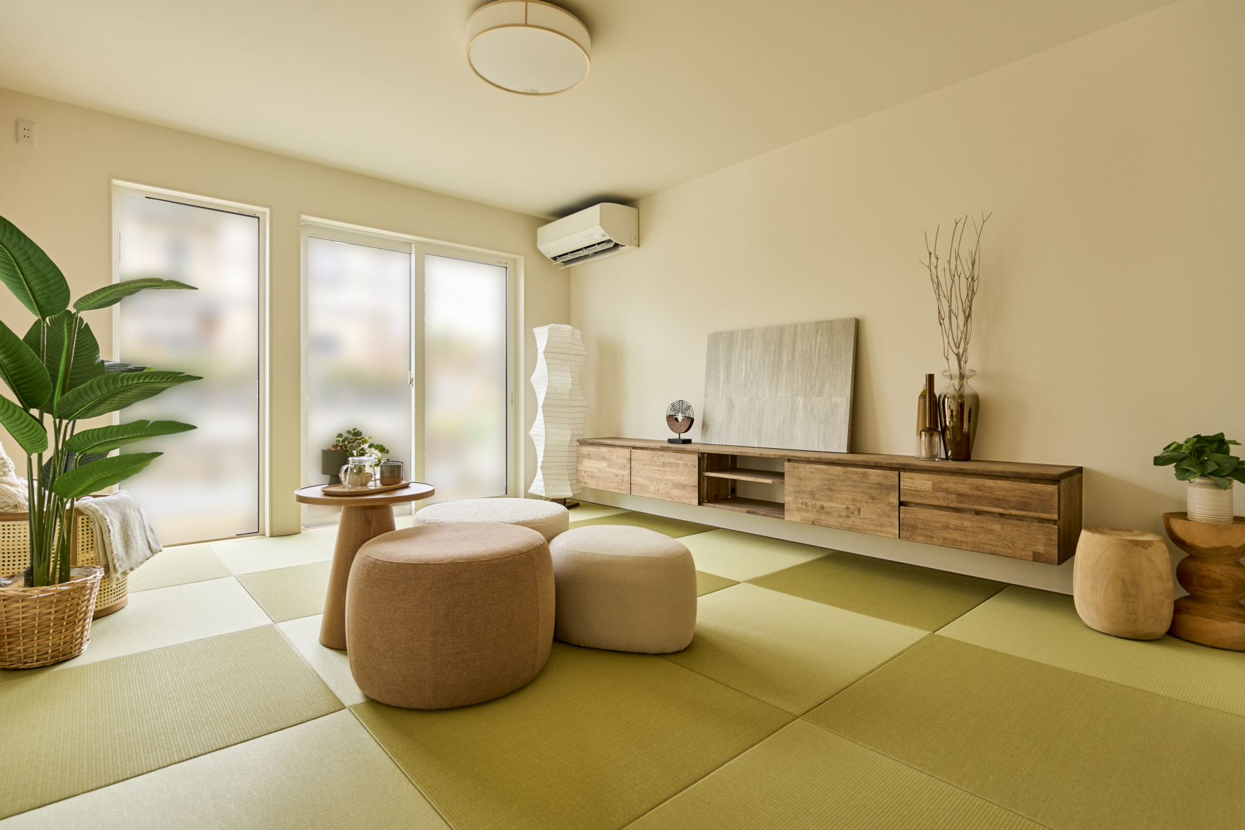 無垢フロアと畳が調和することで落ち着いた空間を演出。