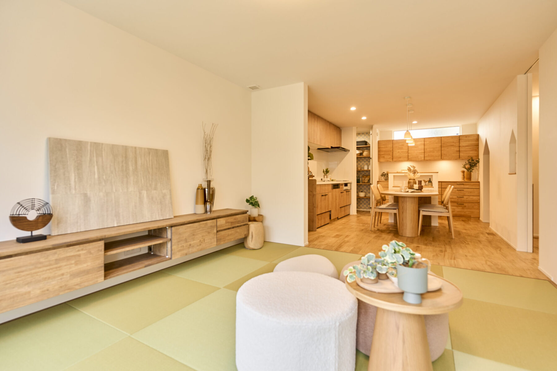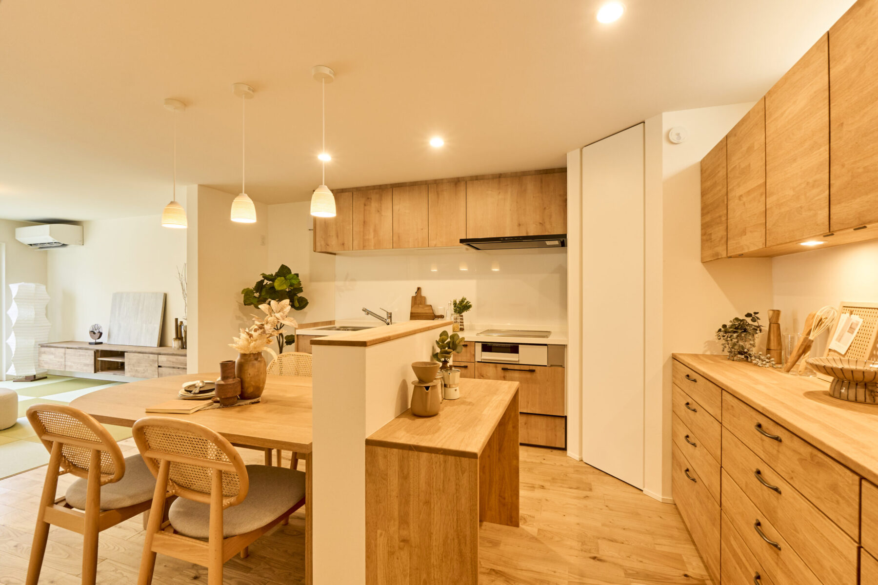 無垢フロアのダイニングキッチンと畳リビングを組み合わせた落ち着きと温かみのあるLDK。
