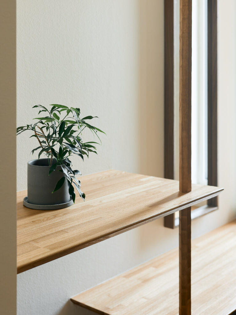 オークのフローリング、天然オイル塗装の木製造作家具が連なる室内は、