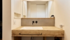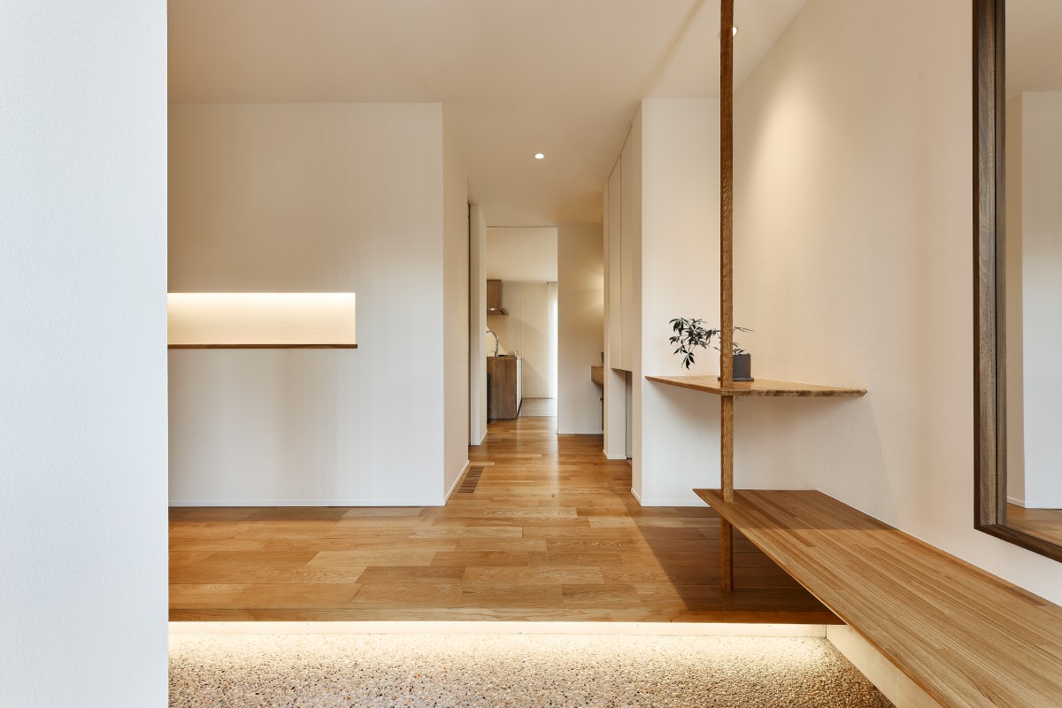 オークのフローリング、天然オイル塗装の木製造作家具が連なる室内は、