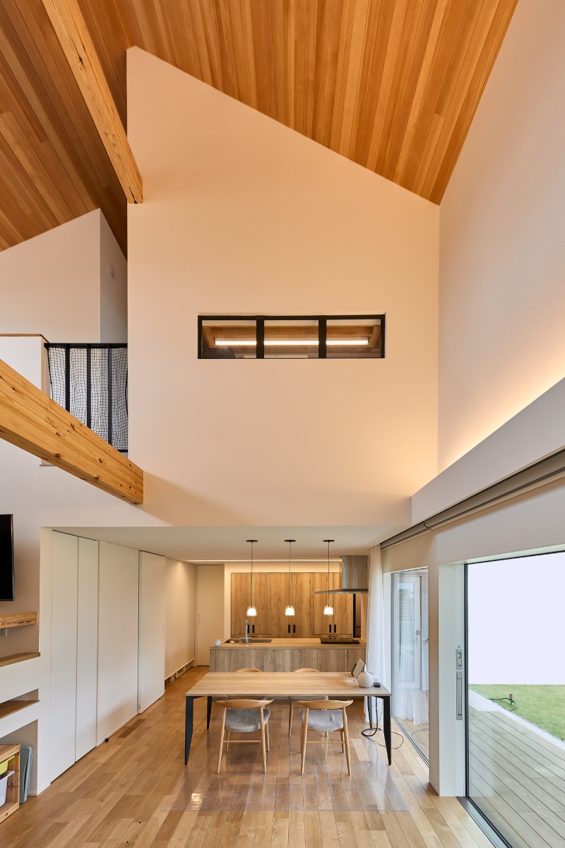 天然ヘム材の木目の美しい勾配天井が広がるリビングを中心に、