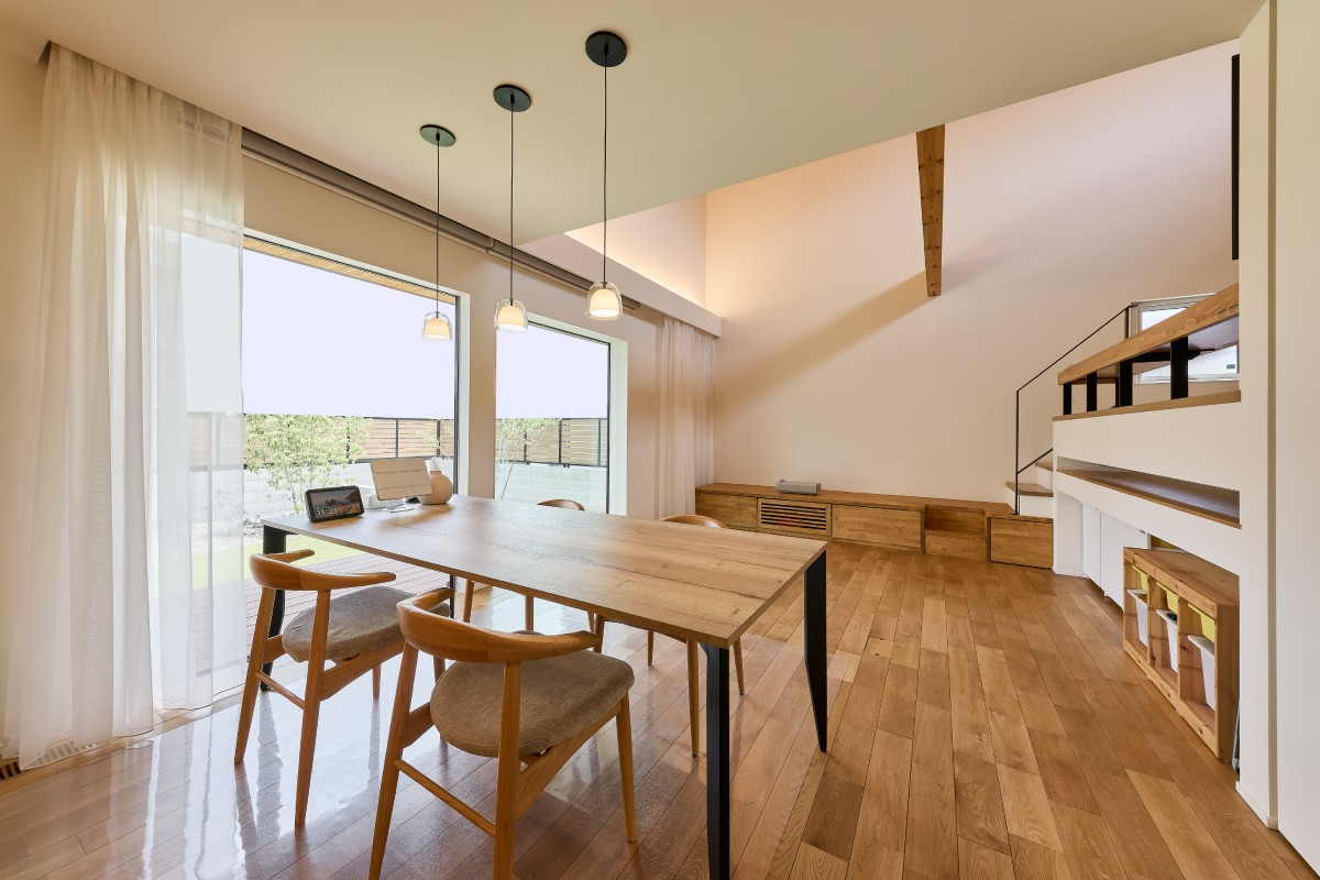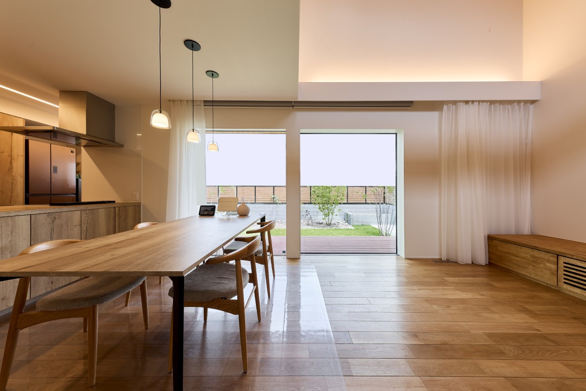 天井高を活かした開放的なリビングと、天然素材の質感を活かした上質なインテリア。