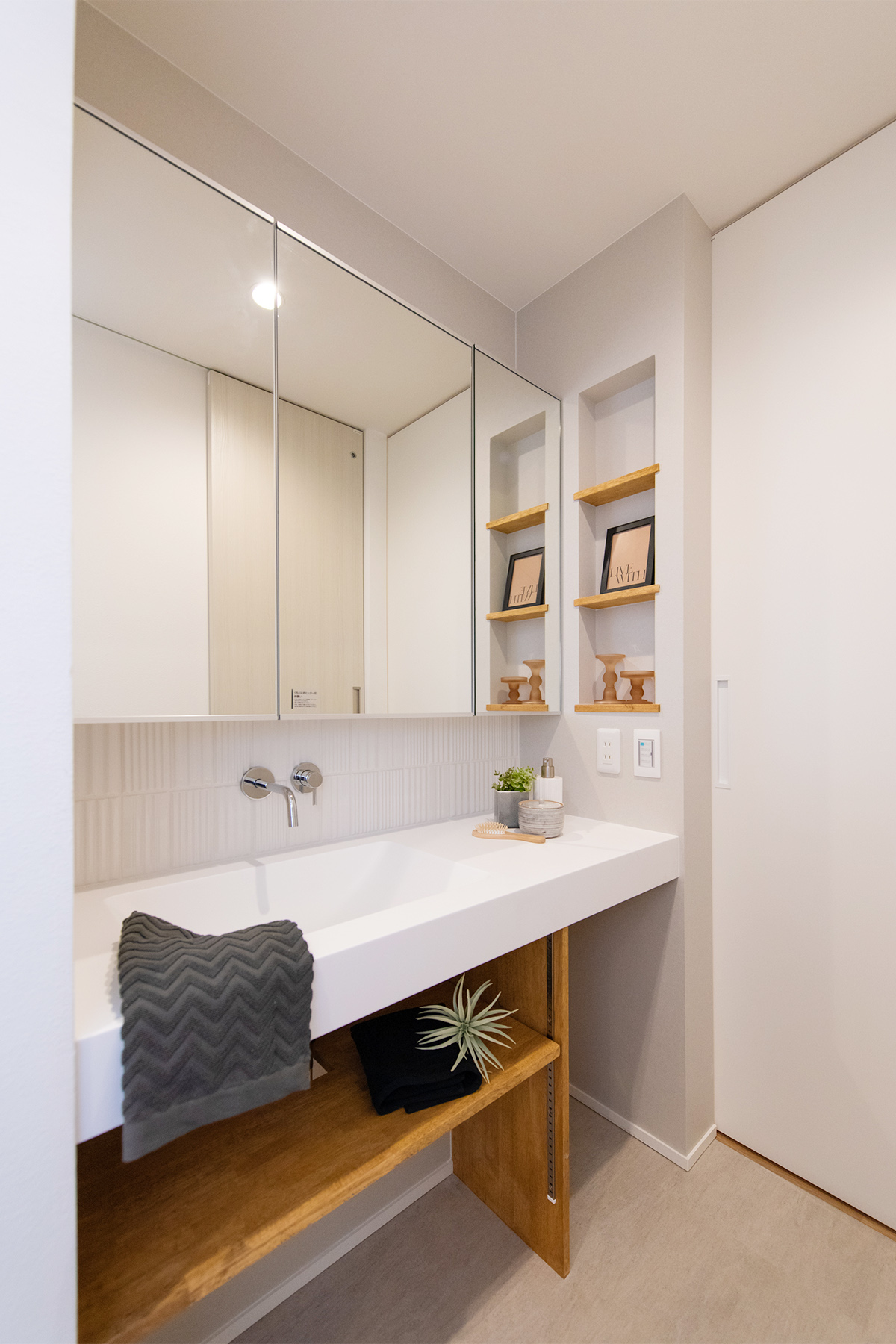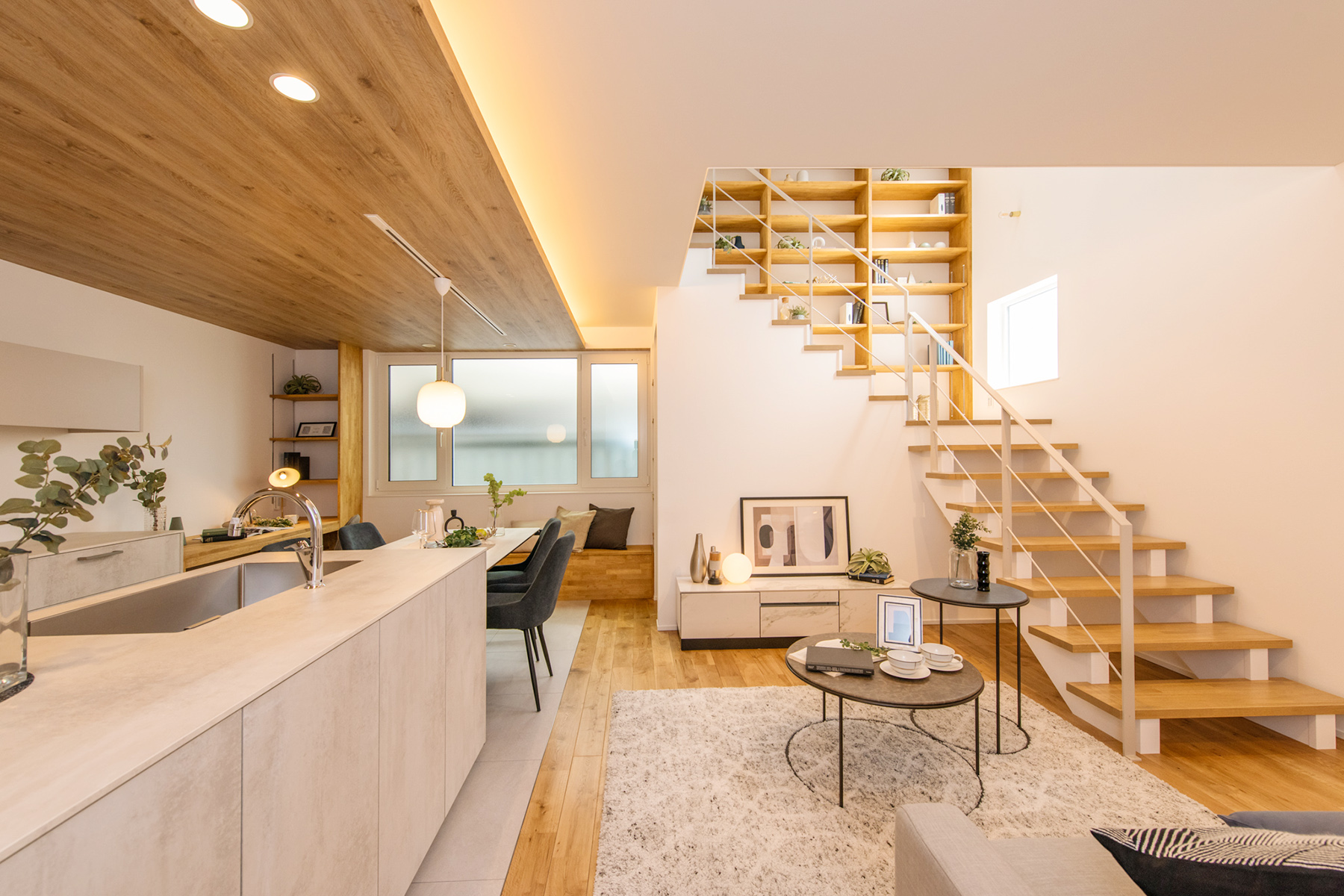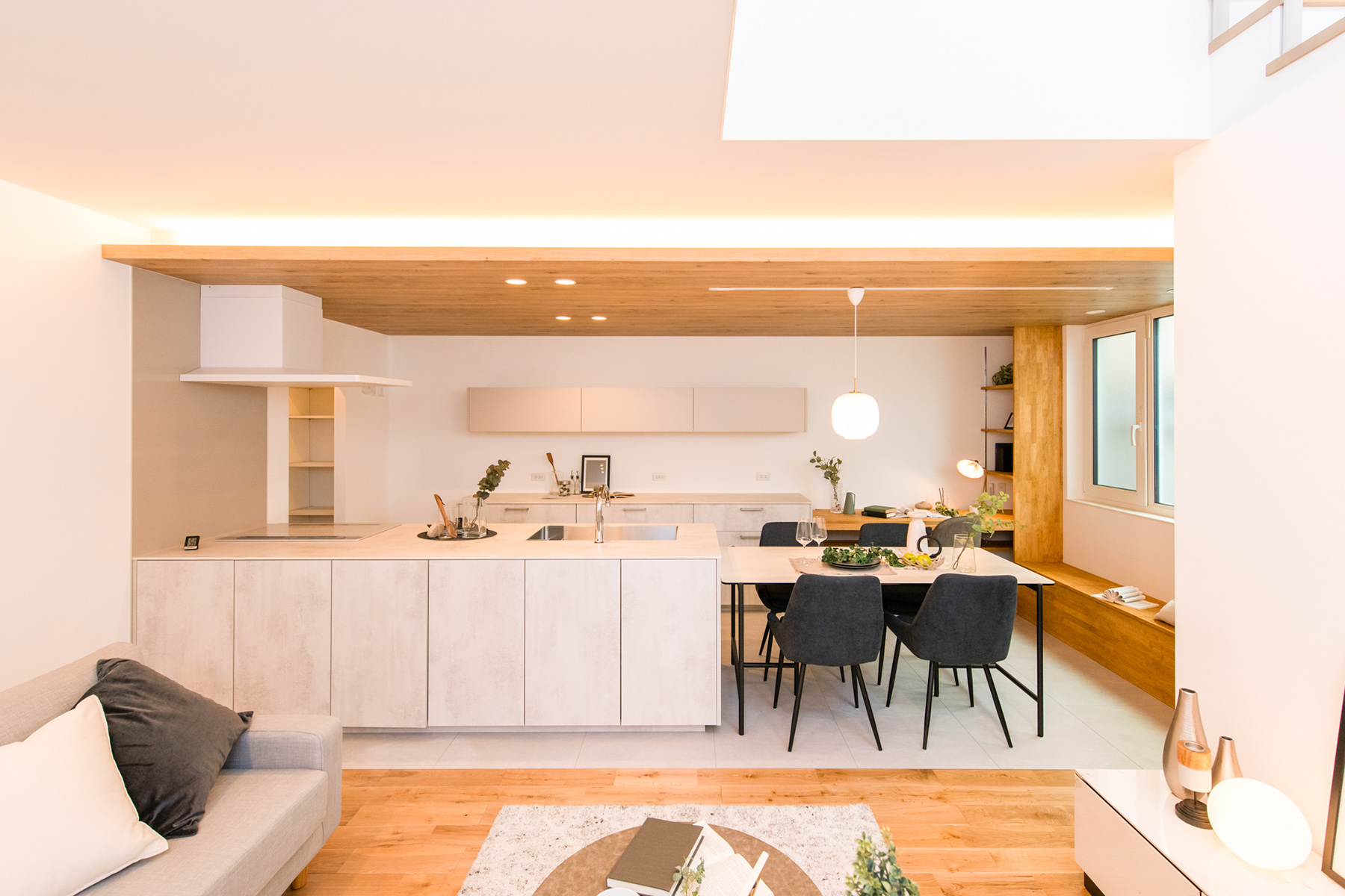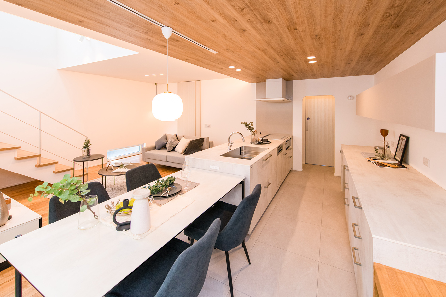 吹抜からの優しい光がLDK全体を明るく照らし、広く開放的に感じられる空間に。