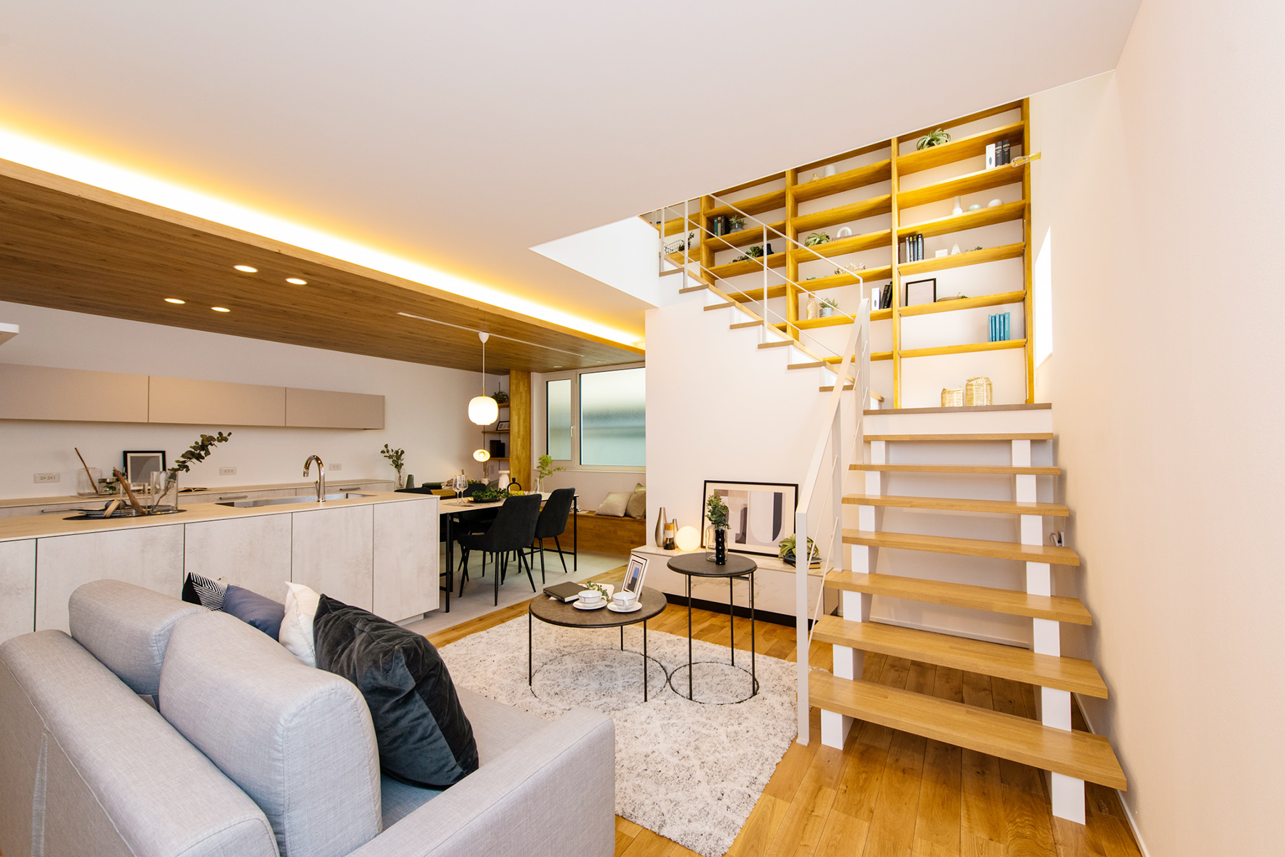 吹き抜けの天井に開いた窓からの太陽エネルギーで、家の中心部まで包まれる。