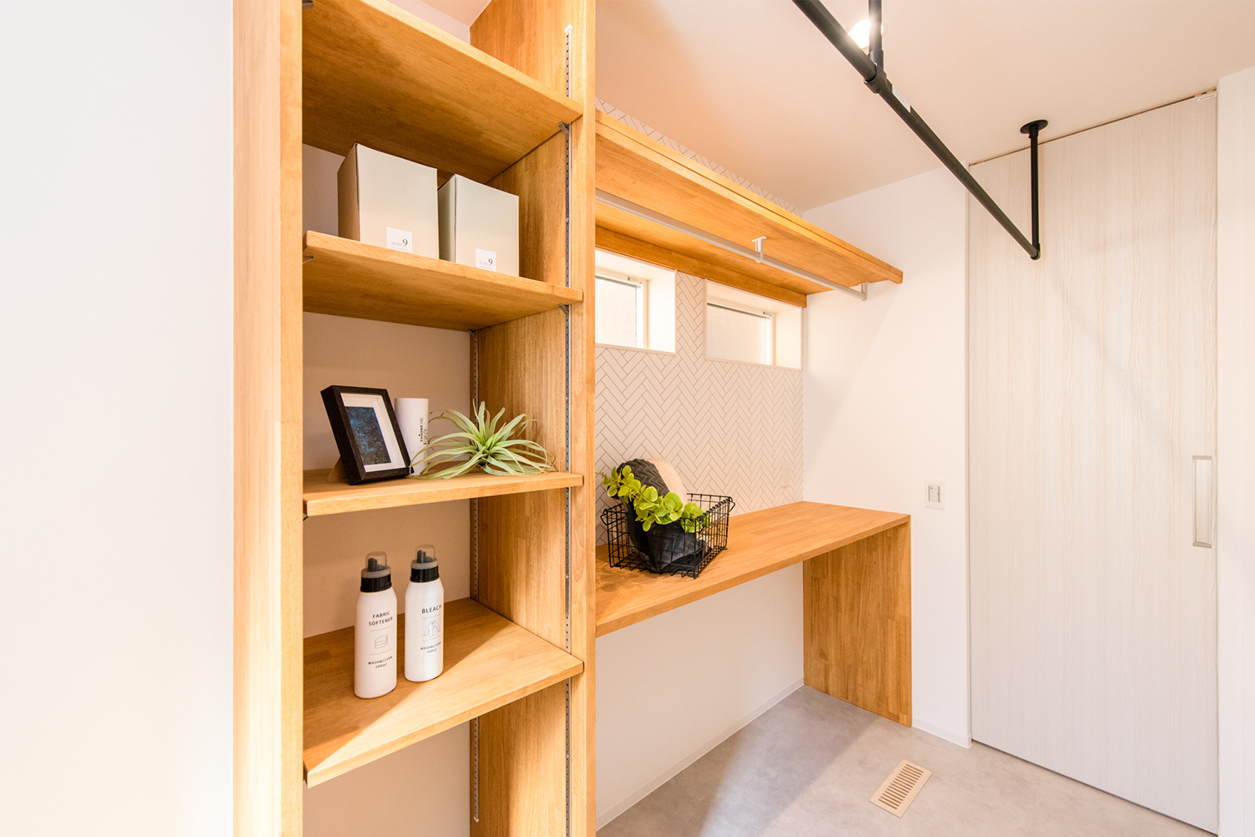 リビングに面した吹抜け階段は、造作収納の壁面収納が2階の天井まで通るこの家の中心。