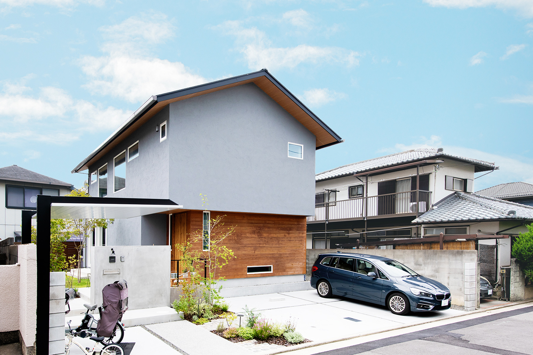 灰色の色合いと自然を感じる木目を黒で引き立てた素敵なお家。
