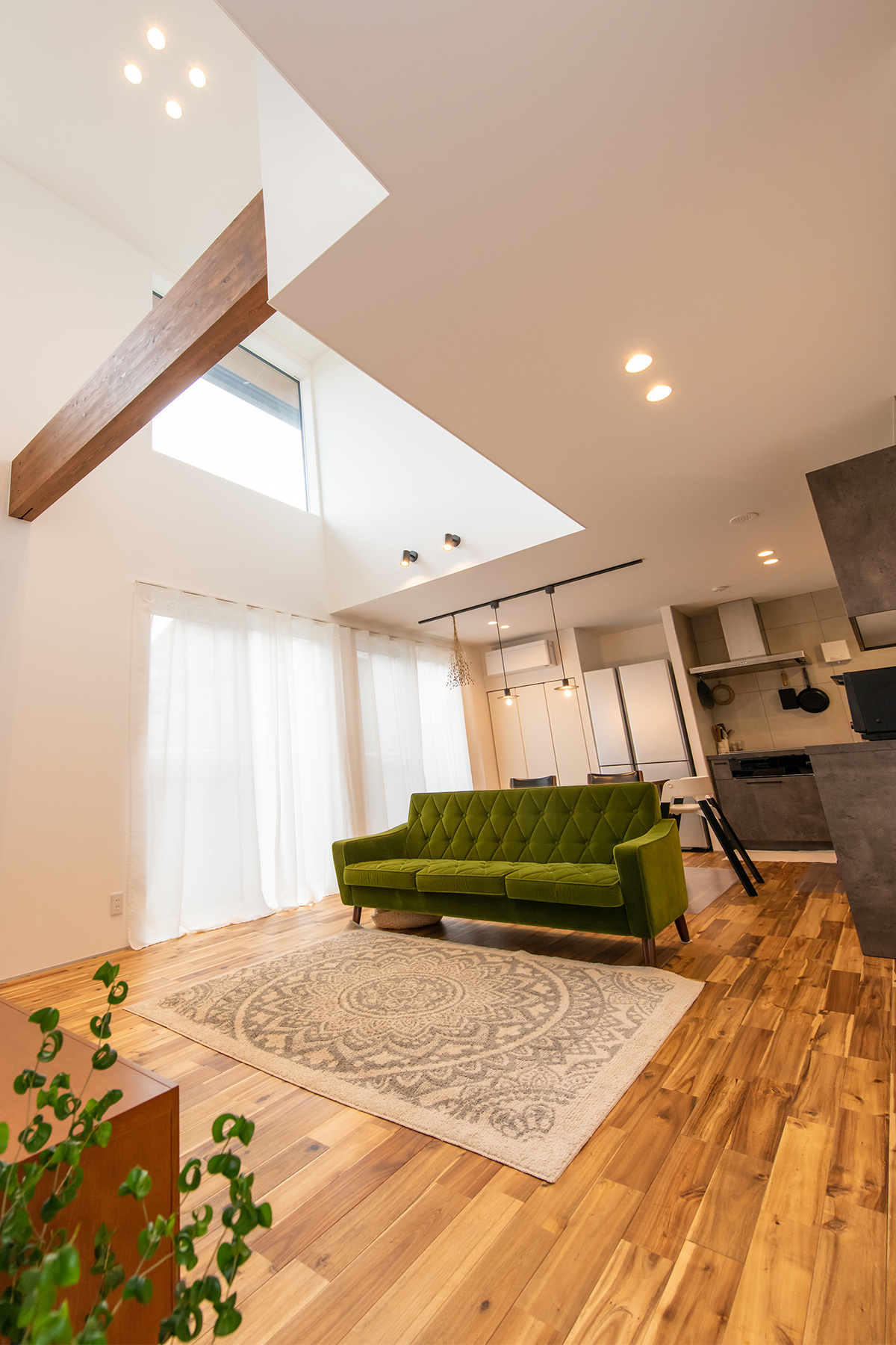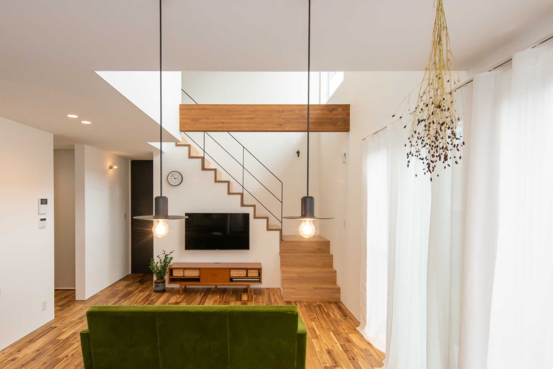 そのリビングは、木部を綺麗に繋いだ印象的な吹抜け階段によって、明るく開放的な空間となっている。