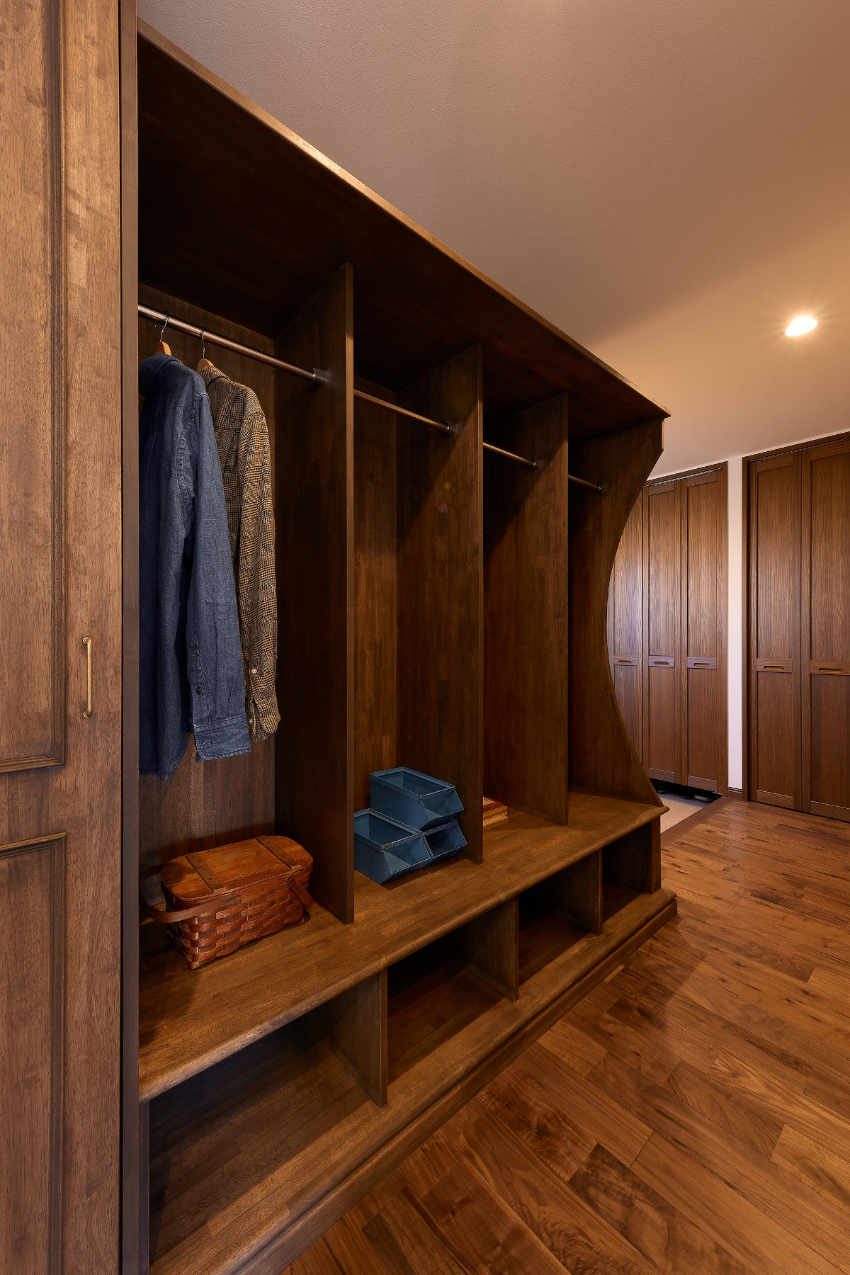 また、リビングに物が集まりすぎないよう、廊下にはファミリーロッカーを設け、家族それぞれの持ち物の場所をつくりました。